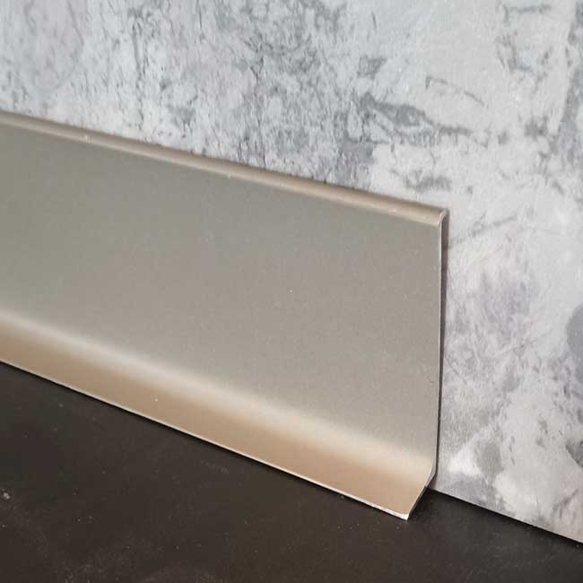 Алюминиевый плинтус 6см форма сапожок, оттенок серый шампань матовый. Цвет играет в зависимости от освещения. Монтаж на клей. Стыковочные элементы из крашеного алюминия. При монтаже без фурнитуры плинтус запиливают в углах